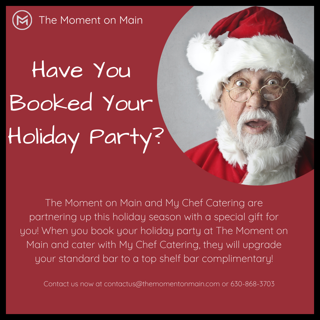 Book your holiday party at The Moment on Main and cater with My Chef to receive a complimentary upgrade from traditional bar to top shelf!